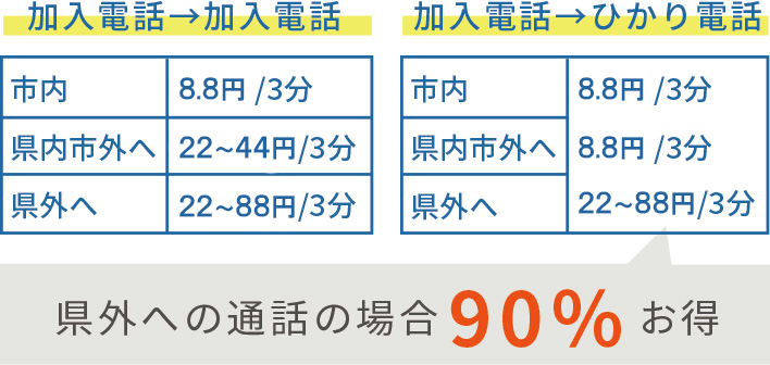 ※2 市内通話・県内への市外通話についてはNTT東日本を、県外通話についてはNTTコミュニケーションズをご利用されているお客さまが、平日午前8時~午後7時の間に通話する場合。市内・県内市外・県外通話は3分、携帯・国際通話は60秒通話した場合の料金です。